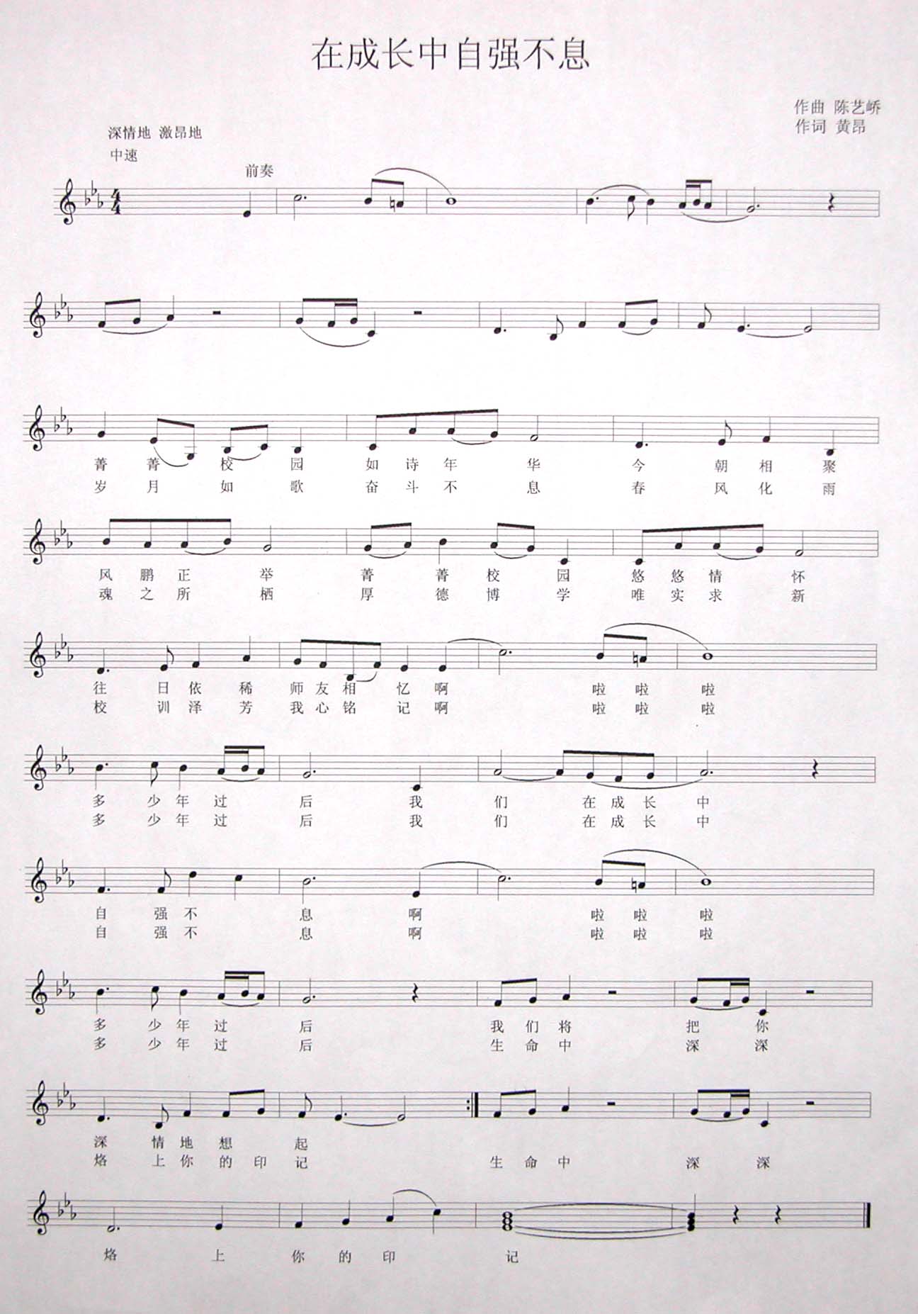 校歌为黄昂作词、陈艺峤作曲的《在成长中自强不息》。